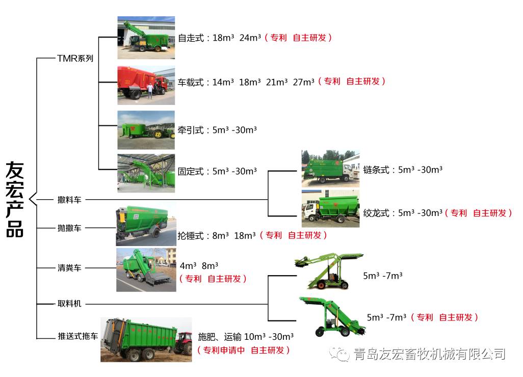 清糞車 (4m3、8m3、12m3)、撒料車 (5m3、6m3、10m3、12m3、18m3、30m3)、有機肥設備、TMR全日糧飼料攪拌機(自走式、車載式、固定式、牽引式、全系5-48m3)、牛床墊料拋撒車(8m3、12m3、20m3、30m3)、推送式糞肥還田車(12m3、18m3、24m3、30m3)、青貯取料機(取料高度5米、6米)、固定式TMR攪拌站